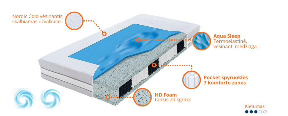 Aukštos kokybės spyruoklinis čiužinys Hybrid AquaSleep, pagamintas iš itin elastingos HD putos ir inovatyvios Aqua Sleep medžiagos, pasižyminčios ne tik išskirtiniu elastingumu, bet ir vėsinančiu efektu. Šis 26 cm aukščio čiužinys puikiai derina komfortą, ilgaamžiškumą ir ekonomiškumą, todėl yra idealus pasirinkimas ieškantiems čiužinio, kuris garantuotų puikią atramą, ilgaamžiškumą bei norintiems vėsesnio miego be perkaitimo.