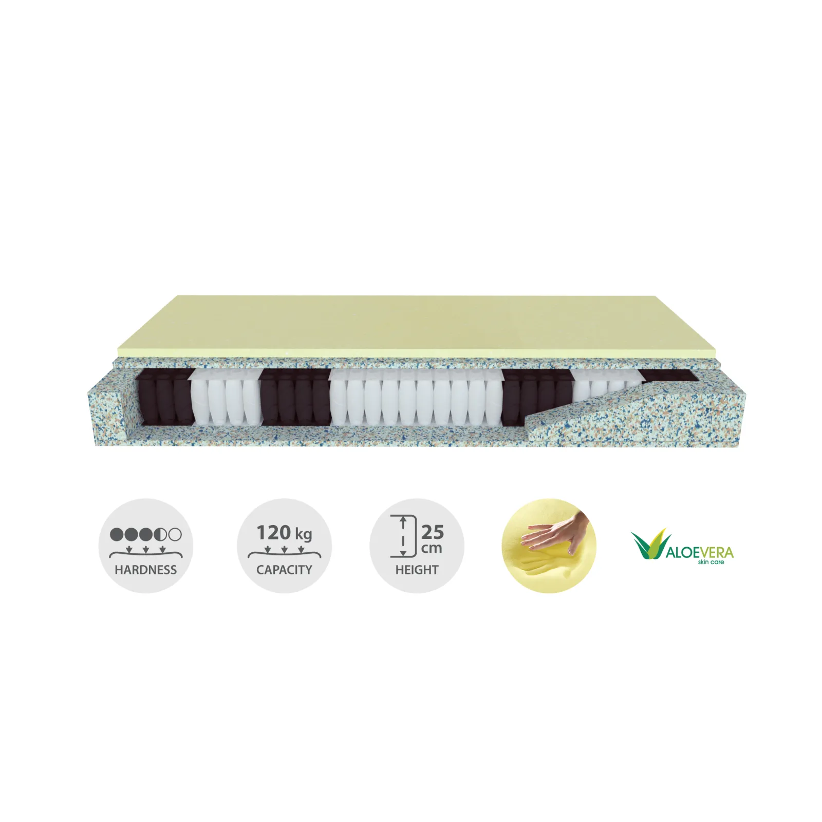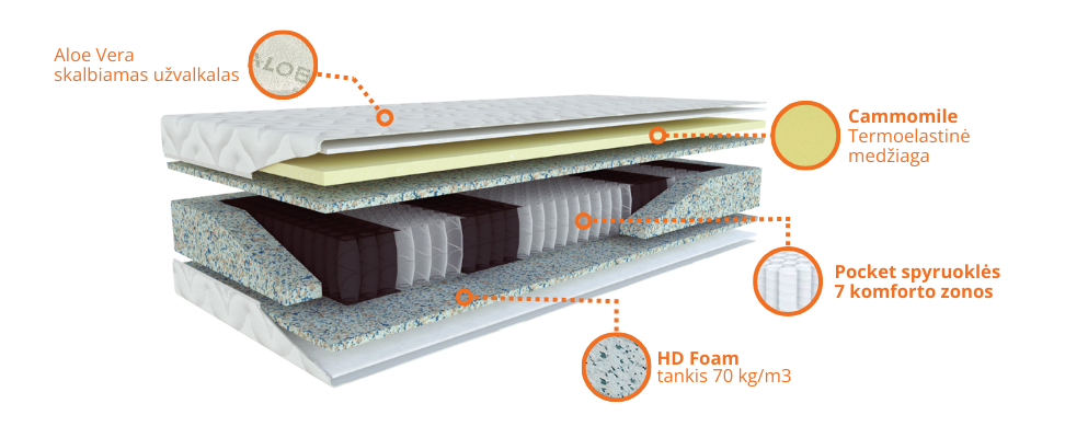 ✓ Pocket spyruoklės- nepriklausomai veikiančios pocket spyruoklės, tiksliai ir selektyviai reaguoja į kūno spaudimą. Tai suteikia stuburui tinkamą atramą per visą jo ilgį ir sumažina spaudimą.