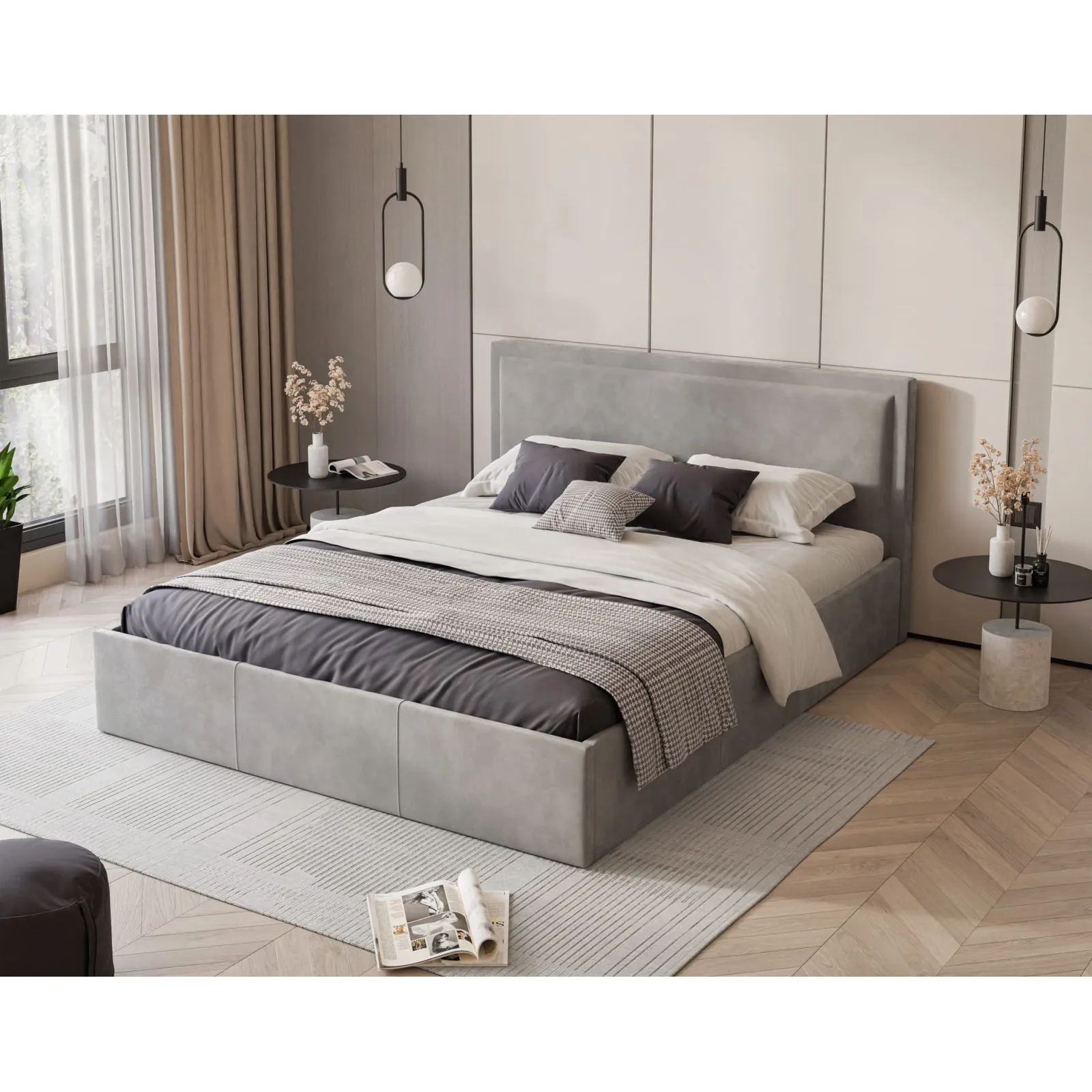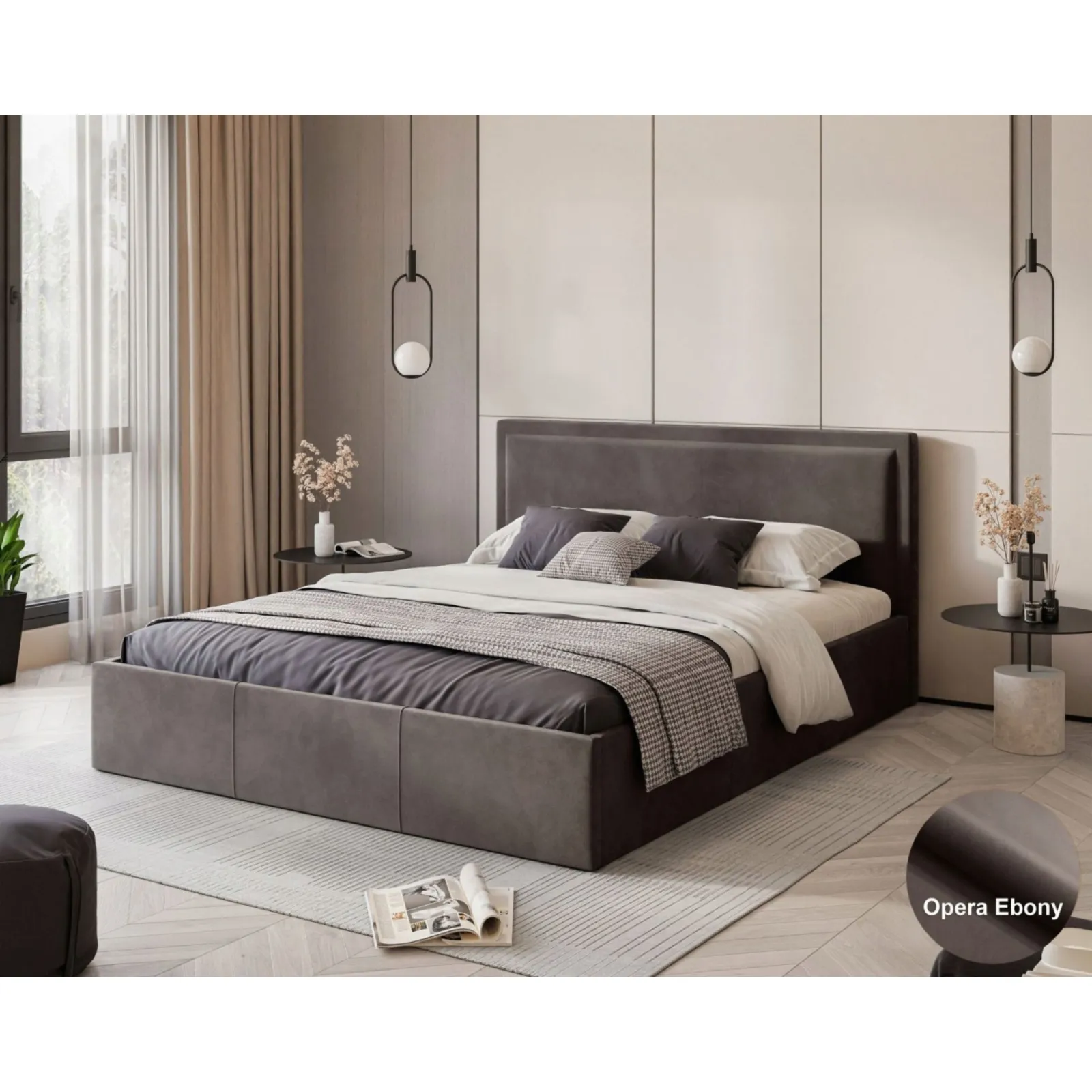 Po lovos pagrindu įrengta talpi patalynės dėžė su patikimu pakėlimo mechanizmu. Spyruokliniai keltuvai leidžia lengvai ir sklandžiai pakelti čiužinio pagrindą, todėl pasiekti dėžės vidų itin paprasta. Tai patogus ir funkcionalus sprendimas kasdieniam naudojimui.