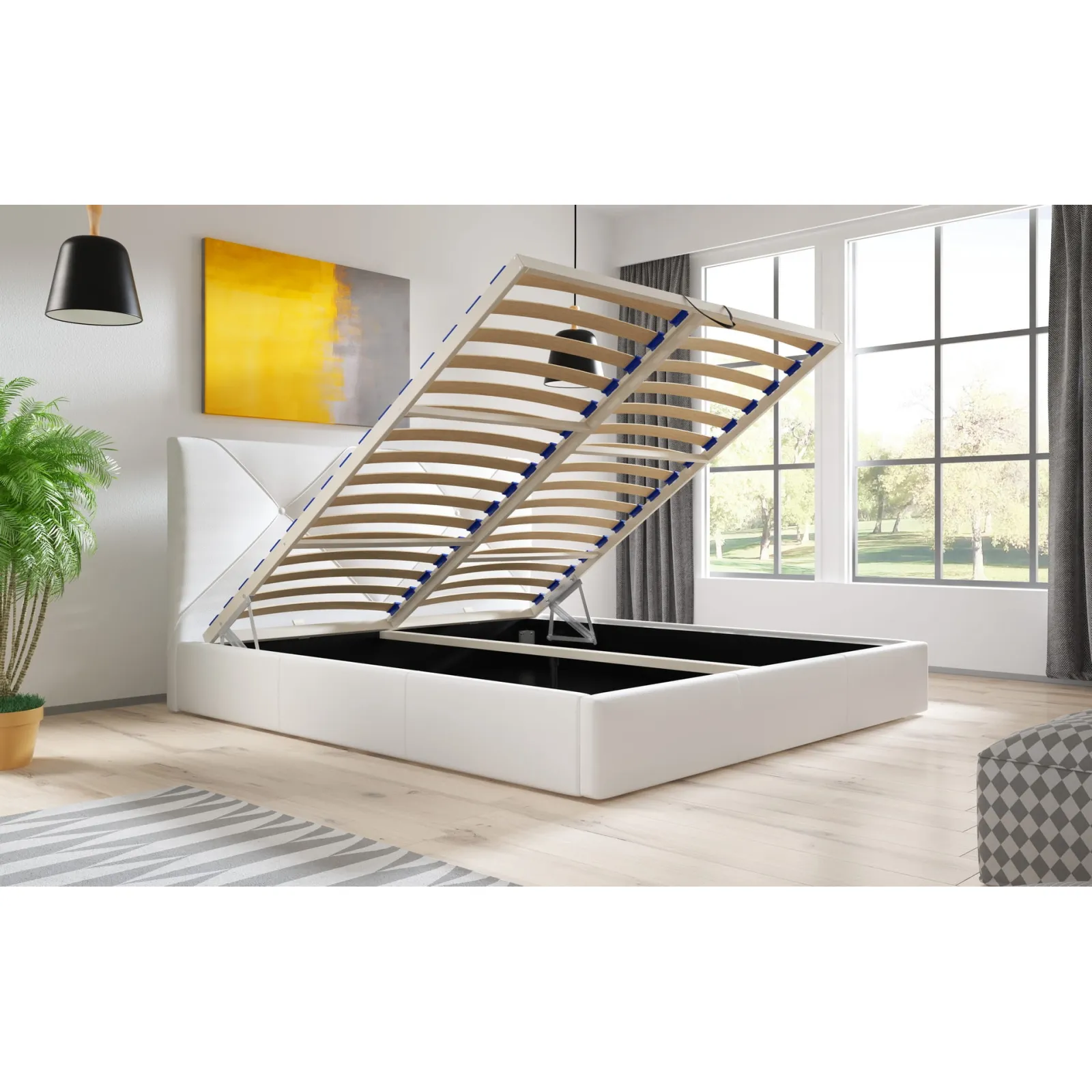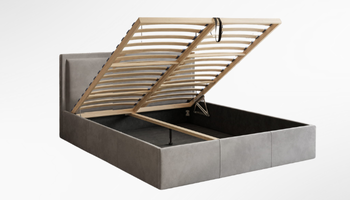 Po lovos pagrindu įrengta talpi patalynės dėžė su patikimu pakėlimo mechanizmu. Spyruokliniai keltuvai leidžia lengvai ir sklandžiai pakelti čiužinio pagrindą, todėl pasiekti dėžės vidų itin paprasta. Tai patogus ir funkcionalus sprendimas kasdieniam naudojimui.